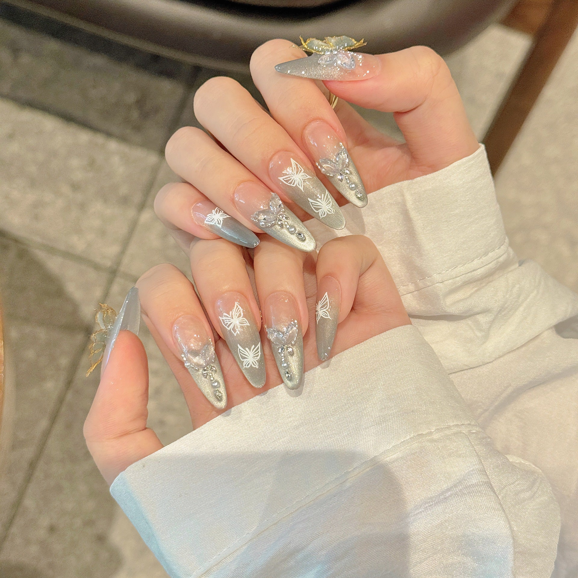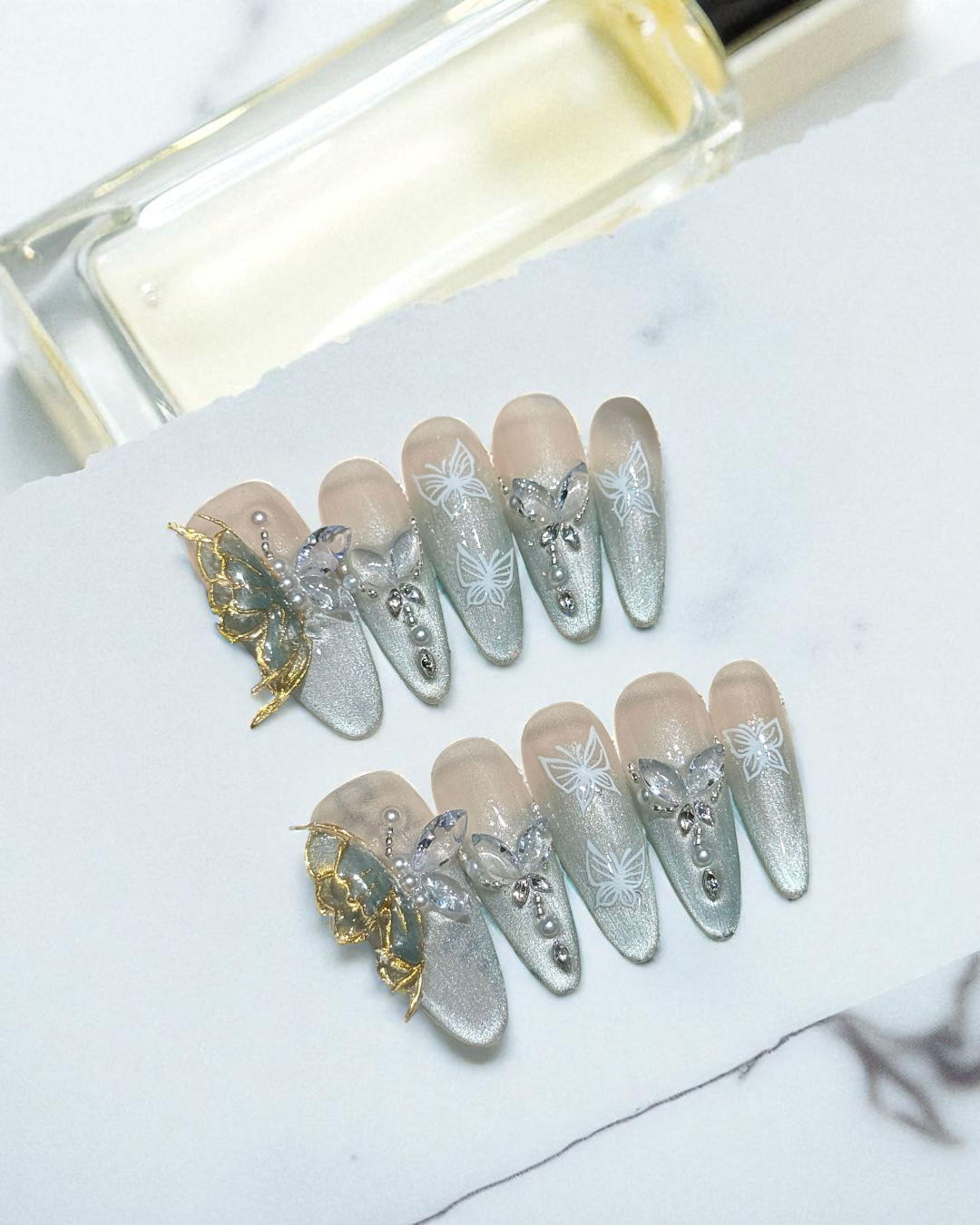 🦋 3D butterfly accents dance over a French cat-eye green glow — whimsical elegance with a twist of nature’s beauty.